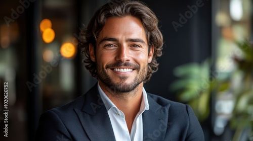 Confident businessman smiling in modern office, crossed arms, professional look, wearing a suit, corporate background, leadership role, business environment, successful entrepreneur
