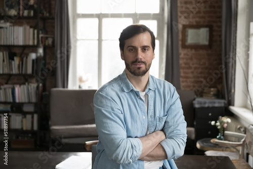 Confident businessman with arms crossed at workplace. Male entrepreneur looks at camera pose in office. Successful businessperson or freelancer portrait, career, professional occupation person concept