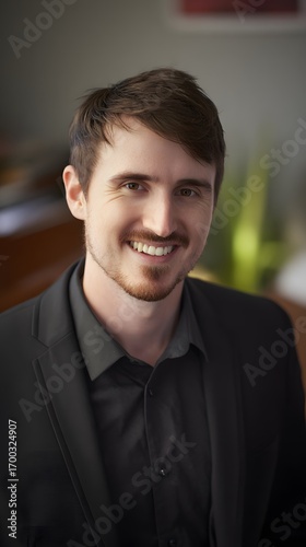 Confident businessperson in formal attire with a subtle smile, soft lighting highlighting professional demeanor.