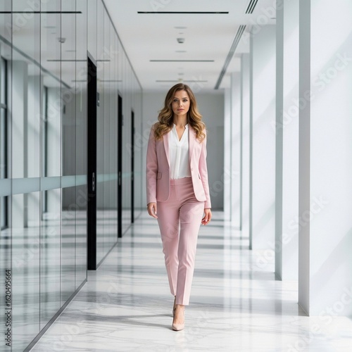 Confident Businesswoman in Elegant Pink Suit Walking in Modern Office