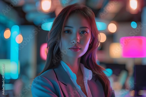 Confident businesswoman in modern office with colorful neon lights, showcasing professionalism and determination.