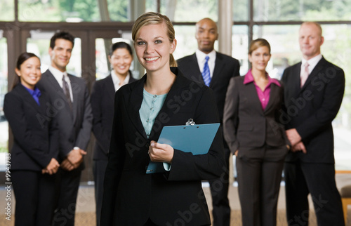 Confident businesswoman posing in front of co-workers