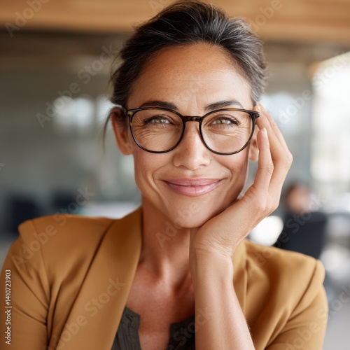 Confident Businesswoman with Glasses Smiles in Professional Environment