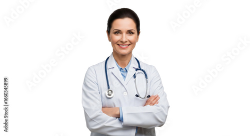 doctor, physician, woman, female, healthcare professional, medical professional, labcoat, white coat, stethoscope, smiling, confident, friendly, arms crossed, portrait, isolated, white background, studio shot, adult, mid-adult, brunette, health, medicine, wellness, care, expert, specialist, professional, trustworthy, happy, approachable, general practitioner, internist, hospital, clinic, service, consultation, uniform, practitioner, empathy, modern, experienced, successful, dedicated