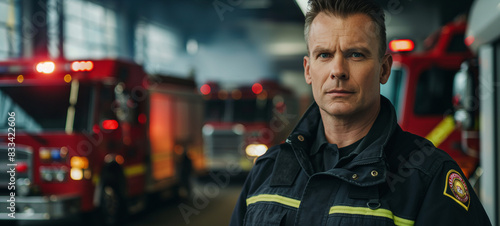 Confident firefighter in uniform standing in front of fire trucks inside a fire station, ready to respond to emergencies, showcasing bravery, professionalism, and dedication.
