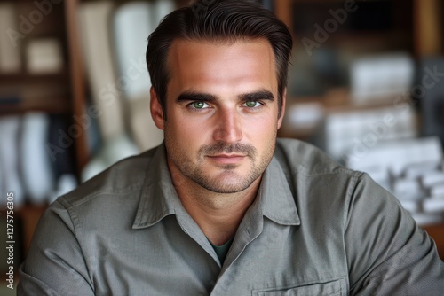 man, male, portrait, head shot, face, closeup, serious, confident, photogenic, attractive, stylish, green eye, brown hair, casual attire, apparel, clothing, fashion, expression, emotion, mood, feeling, person, human, model, adult, young, professional, businessman, men at work, employee, indoor, studio, background, bokeh, neutral, calm, contemplative, thoughtful, determination, resolve