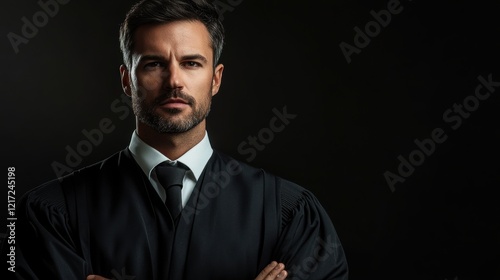 judge, male, robe, black background, serious, professional, courtroom, justice, law, legal, authority, confident, formal, attaching, white shirt