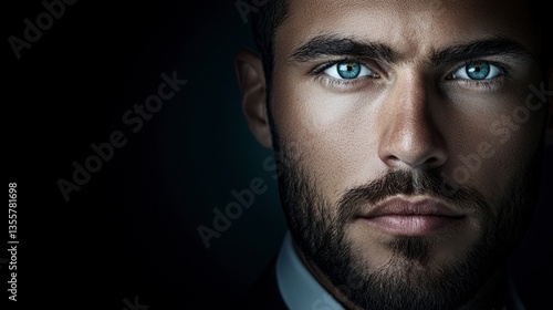 man, portrait, face, eye, blue eye, intense, confident, serious, expression, beard, stubble field, businessman, professional, model, head shot, cinematic, lighting, dark background, closeup, detail, sharp, sharpened, hi-res, photo, image, male, photogenic, attractive, emotion, mood, style, person, human