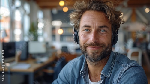 man, earphones, office, smile, beard, work, modern, workspace, confident, casual attire, technology, creative, professional, desk, computer, background, blur, lighting, indoor, interior, design, positive, mood, job, career, business, employee, freelancer, remote, workplace, person, face, blue, jean, happy, working, portrait, expression, male, head shot, studio, open, concept, attractive