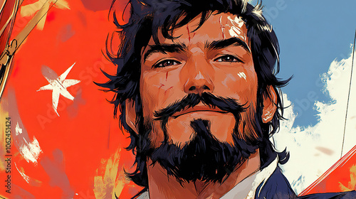man, confident, beard, moustache, red background, photogenic, face, masculine, closeup, warrior, rugged, proud, hero, character, illustration, portrait, expressive, artistic, bold, digital artwork, vibrant, modern art, strength, charisma, colourful, determined, adventurous, heroic, facial hair, black hair, stylised, leader, ia, ai