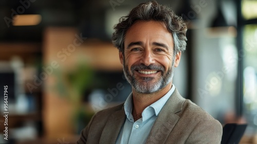 Confident Mature Businessman Smiling in Modern Office Environment with Natural Light