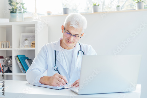 Confident mature caucasian senior male doctor making notes while using laptop for telemedicine with patients at hospital. GP make online video call consult patient. Online remote medical appointment.