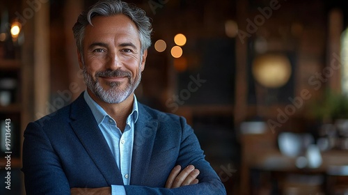 Confident Middle-Aged CEO in Blue Suit Standing with Arms Crossed, Smiling and Proud in Office - Generative AI
