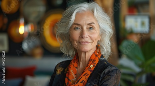 Confident Professional Woman in Vibrant Decor, an older woman exuding confidence, surrounded by lively and colorful decor that enhances her dynamic presence.