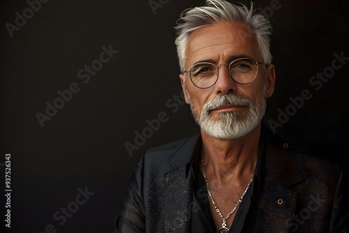 Confident Senior Man with Silver Hair, Gray Beard, and Round Glasses in Black Jacket