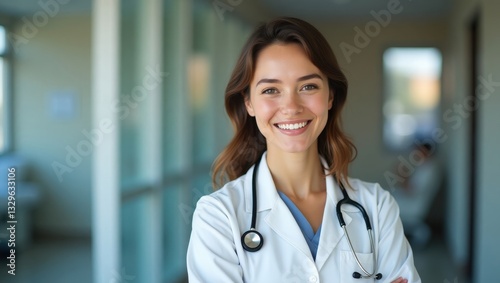 Confident Smiling Female Doctor in White Coat Healthcare Professional Portrait