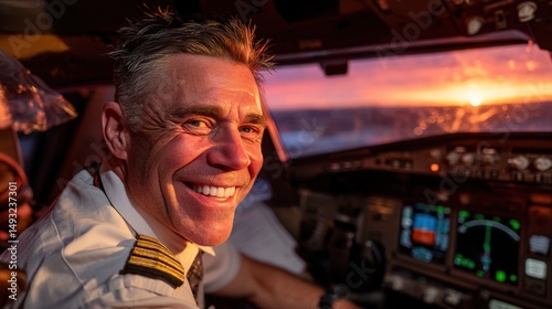 pilot, male, captain, uniform, cockpit, aeroplane, aircraft, aviation, airman, confident, smiling, professional, portrait, man, adult, caucasian, sitting, indoor, twilight, happiness, calm, relaxed, leadership, success, career, life events, transportation, airline, flight, crew, travel, occupation, navigation, instrument, control, technology, mentor, cosy, soft, diffused, natural, light, window, elegant, positive, independent, achievement, proud