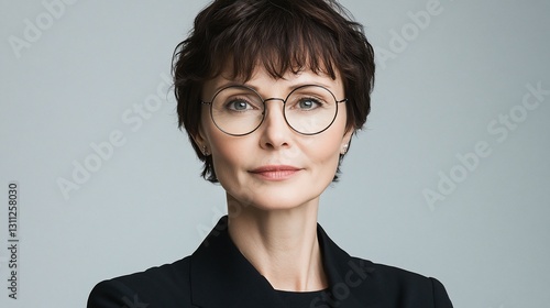 woman, portrait, head shot, confident, professional, goggles, female, business, executive, serious, studio, background, grey, neutral, face, expression, look, eye, hair, short, style, people, person, model, image, photo, photo, adult, mature, career, corporate, leadership, management, success, power, strong, elegant, stylish, beauty, attractive, smart, intelligent, expertise, authority