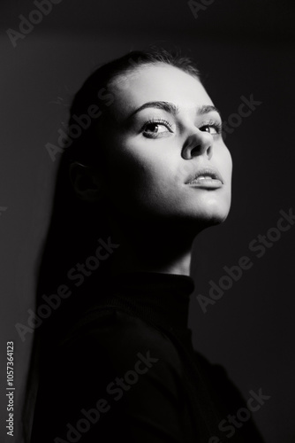 Confident woman with long hair in a black turtleneck, gazing upward against a dark background, embodying strength and elegance. Artistic monochrome portrait.