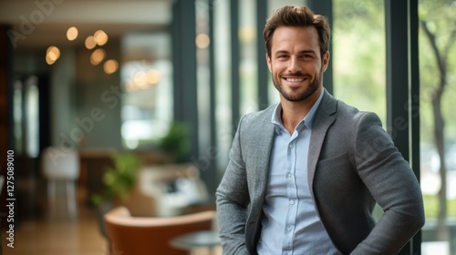 confident, young, male, business, smiling, adult, indoor, window, suit, professional, office, beard, modern, smart, stylish, photogenic, casual attire, workplace, natural, light, cheerful, happy, attractive, posture, charismatic, fashionable, bright, interior, relaxed, expression, positive, engaging, personality, executive, workspace, networking, ambitious, entrepreneur, success, vibrant, energetic, elegance, sophistication, sharpened, leadership, connection, open, inviting