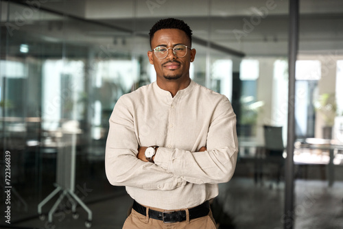 Confident young African American business man leader looking at camera standing arms crossed in office. Successful Black businessman manager, professional executive or male entrepreneur, portrait.