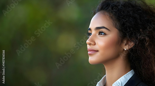woman, portrait, young, adult, female, businesswoman, professional, confident, hopeful, thoughtful, serious, calm, peaceful, serene, curly hair, dark hair, freckle, natural, beauty, make-up, formal, business attire, blazer, white shirt, outdoors, nature, green background, blurred background, bokeh, soft focus, natural light, daytime, closeup, head shot, expression, face, eye, looking up, aspiration, ambition, dreamy, contemplative, pensive, optimistic, positive, strength, empowerment, diversity, inclusion