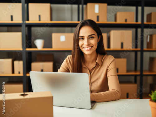 entrepreneur, startup, businesswoman, workspace, e-business, cardboard box, shipping, warehouse, inventory, fulfillment, logistic, smiling, laptop, office, work, professional, young adult, female, career, home office, storage, delivery, retail, e-business, commerce, customer service, efficiency, organisation, success, distribution, self employed, online shop, workstation, empowerment, technology