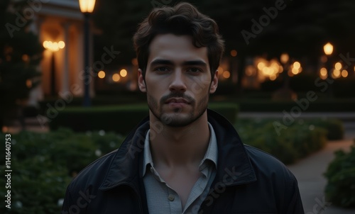 young men, portrait, evening, park, urban, photogenic, confident, casual attire, dark hair, night, outdoors, fashion, male model, greenery, soft focus, bokeh, relaxed, nature, atmospheric, youthful, elegance, loneliness, charming, contemplative, gentleman, sophisticated, twilight, fashionable, serenity, solitude, hip, city life, evening light, youth, modern style, night time