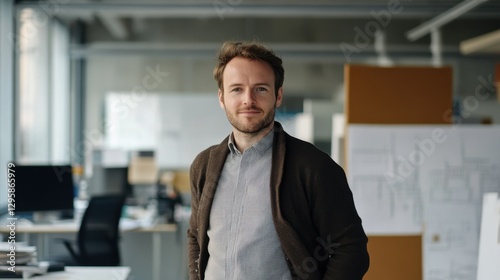 man, young adult, office, workspace, confident, casual attire, professional, indoor, business, creative, architecture, contemporary, sharpened, standing, smile, cheerful, lighting, office furniture, planning, collaboration, teamwork, workplace, wearing, shirt, sweater, photogenic, lifestyle, career, success, motivation, organisation, interior, environment, technology, corporate, portrait, relaxation, innovation, friendly, people, interaction, strategy, idea, thought, vision, communication, networking