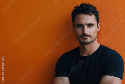 portrait, man, young adult, confidence, casual attire, orange background, male model, photogenic, stylish, relaxed, modern, lifestyle, fashion, closeup, studio shot, masculine, trendy, body language, urban, contemporary, individuality, facial hair, grooming, fitness, health, beauty, charisma, self-assured, emotional, expression, personality, artistic, vibrant, photo, eclectic, plain, background, room, copy, space, 20s, male, person