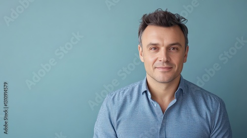 portrait, man, smiling, blue background, confidence, casual attire, adult, happiness, positive, lifestyle, professional, friendly, relaxed, male, cheerful, studio shot, closeup, facial expression, modern, self-assured, approachable, young adult, head shot, communication, expression, emotion, well-groomed, stylish, indoor, simplicity, calm, serene, natural light, beauty, caucasian, pastel, background, copy, space, middle-aged, 40s, person, 1