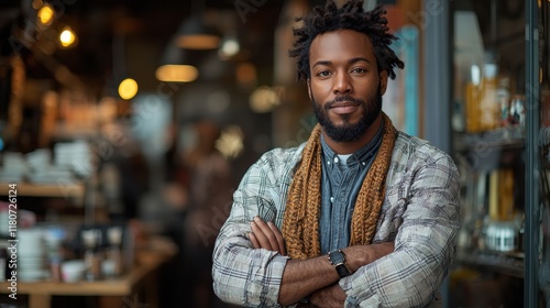 man, cafes, casual attire, smile, confidence, portrait, lifestyle, happy, standing, indoor, relaxation, community, culture, personality, male, grooming, emotion, friendship, hot drink, socialising, people, engagement, interaction, modern, urban, background, stylish, cheerful, beard, barista, leisure, closeup, fashion, expression, happiness, environment, cosy, ambience, natural light, small business, professionalism, joy, warmth, customer service