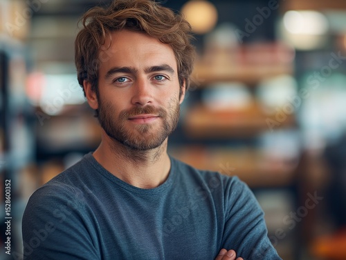 man, portrait, smiling, confident, casual attire, short hair, brown hair, beard, home decor, interior, bookshelf, relaxed, adult, male, arms crossed, light background, bokeh, professional, modern style, young men, natural light, thoughtful, warm colors, urban setting