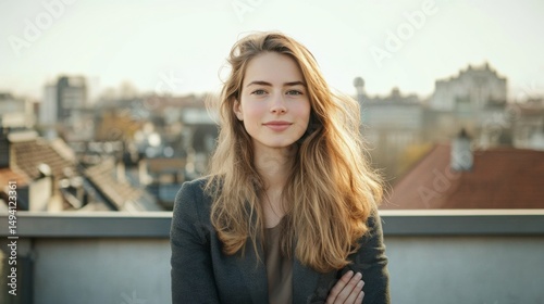 woman, young, confident, rooftop, city, city landscape, urban, beautiful, attractive, girl, female, portrait, model, fashion, style, hair, blond, long hair, outdoors, sunshine, sunlight, day, happy, smiling, professional, business, success, ambition, modern, lifestyle, elegant, sophisticated