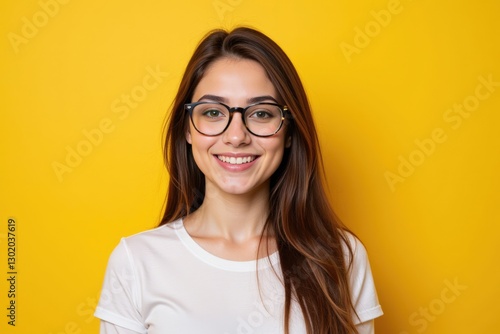 Confident Young Woman with Long Dark Hair and Glasses Smiling Against a Bright Yellow Background, Showcasing a Cheerful and Approachable Personality