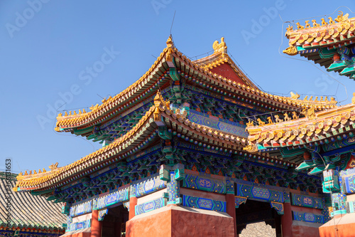 architecture, building exterior, no people, arch, clear sky, blue, temple, asia, china, chinese culture, beijing, ornate, built structure, old, past, history, national landmark, famous place, capital city, outside, architectural, nobody, no one, low angle, from below, looking up, landmark, historical, historic, heritage, cultural, culture, arch, arched, capital city, traditionally, chinese