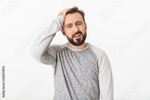 20s, adult, affection, attractive, background, photogenic, boy, brunette, care, casual attire, caucasian, emotional, guy, indoor, isolated, male, man, portrait, posing, sad, negative, confused, 1, white, young, camera, bearded, wall, hand