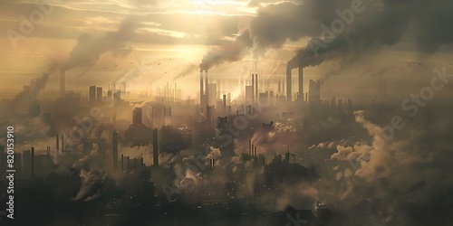 pollution, industry, city landscape, smog, environment, skyline, hazy, atmospheric, degradation, smoke, urban, power, factory, architecture, landscape, energy, emission, climate, crisis, impact, gloomy, dramatic, cinematic, lighting, contrast, technology, infrastructure, congested, metropolitan, towering, skyscraper, smokestack, outline, visible, dismal, ominous, foreboding, desolate, bleak, gritty, futuristic, apocalyptic, industrial, toxic, hazardous, environmental