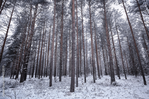 coniferous forest covered with hoarfrost background, winter landscape snow trees