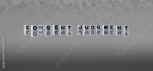 consent judgment word or concept represented by black and white letter cubes on a grey horizon background stretching to infinity