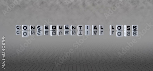 consequential loss word or concept represented by black and white letter cubes on a grey horizon background stretching to infinity