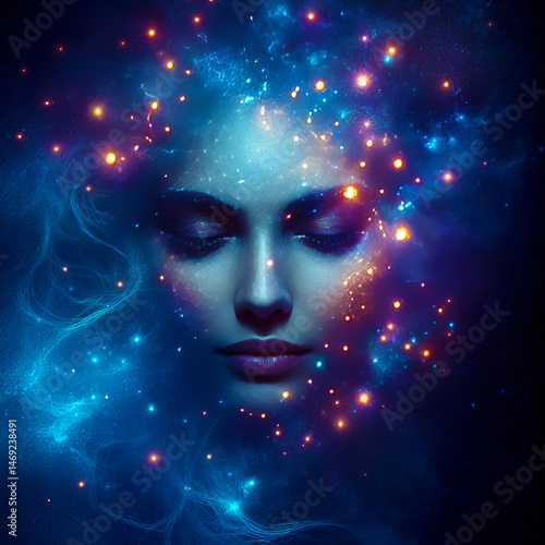 aethereal, portrait, woman, face, formed, glowing, constellations, star, cluster, vibrant, cosmic, dust, cloud, deep, indigo, night, sky, serene, mystical, expression, decorative, fantasy, art, surreal, illustration, digital, painting, beauty, celestial, space, universe, goddess, magic, dreamlike, poster, vertical, nobody