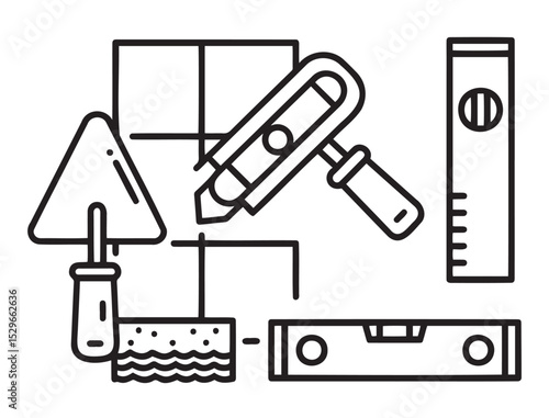 construction, renovation, tool, icon, outline, design, plastering, trowel, level, measurement, ruler, scraper, equipment, home improvement, craftsmanship, project, professional, workspace, graphic, simplicity, service, hardware, building, precision, material, artistic, organisation, technique, detail