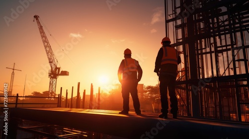 Construction chart graphic background, AI technology in construction industry, engineers working at construction site at sunset, AI generated, copy space for text