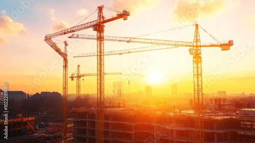 construction, crane, sunset, building, sky, city, urban, work, industry, development, engineering, machine, machinery, site, architecture, metal, steel, tower, silhouette, gold, hours, orange, yellow, red, light, horizon, sun, progress, structure, daylight, high, rise, evening, cloudy, tall, beam, heavy, equipment