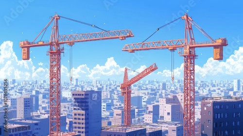 crane, city, construction, urban, building, sky, skyscraper, tower, structure, machine, work, development, industry, architecture, metal, steel, concrete, blue, orange, cloud, daytime, modern, design, engineering, industrial, machinery, aerial, high, tall, progress, growth, future, urbanisation, infrastructure, skyline, horizon, view, up high
