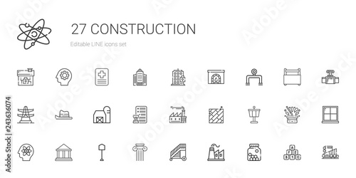 construction, icon, set, vector, cone, factory, ladder, column, shovel, museum, atom, control, tower, floor, planning, barn, hat, electric, pipeline, chimney, building, mall, brick, window, valva, toolbox, office, hospital, gear, house, illustration, design, symbol, signs, isolated, element, graphic, line, black, white