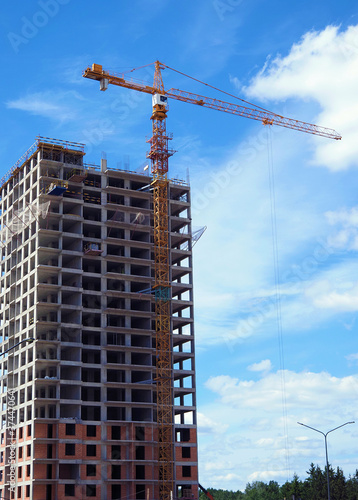 Construction of a modern frame residential building. Tower construction crane.