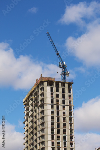 Construction of modern multi-storey buildings. Construction of a new city block. Buildings under construction and tower cranes.