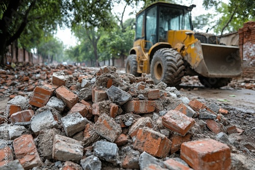 construction, machinery, roadwork, brick, urban, debris, excavation, building, maintenance, infrastructure, heavy equipment, dirt, landscape, site, equipment, loader, repair, destruction, cleanup, city, neighbourhood, debris, vehicle, labor, tool, environment, clearing, rock, land, unpaved, ground, safety, worksite, industrial, manual, process, material, street, transport, removal, operating, project, engineering